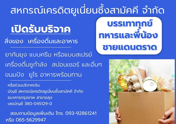 สหกรณ์เครดิตยูเนี่ยนซึ้งสามัคคี จำกัดขอเชิญชวนสมาชิก พร้อมประชาชนชาวไทย ร่วมบริจาค สิ่งของเครื่องอุปโภค บริโภค ของใช้จำเป็นตามที่แจ้ง เพื่อมอบให้ทหารชายแดนไทยและพี่น้องประชาชนที่อพยพ พื้นที่ในจังหวัดตราดรับบริจาค ตั้งแต่วันที่ 12-19 ธันวาคม 2568 ณ สหกรณ์เครดิตยูเนี่ยนซึ้งสามัคคี จำกัดหมู่ที่ 5 ตำบลวันยาว อำเภอขลุง จังหวัดจันทบุรี หรือบริจาคเงิน บัญชีธนาคารกรุงเทพ ชื่อบัญชี สหกรณ์เครดิตยูเนี่ยนซึ้งสามัคคี จำกัดเลขบัญชี 380-045129-0 ขอร่วมเป็นกำลังใจและเป็นส่วนหนึ่งในการรักษาอธิปไตยของชาติไทย